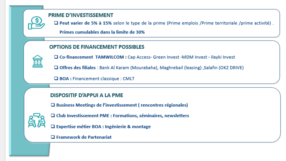 PME Invest By BOA est solution clé en main combinant différentes options de crédit (CMT Direct, cofinancement TAMWILCOM, ou financement à travers les filiales du groupe) + primes à l’investissement par le CRI + programme d’appui PME + conditions de financement incitatives